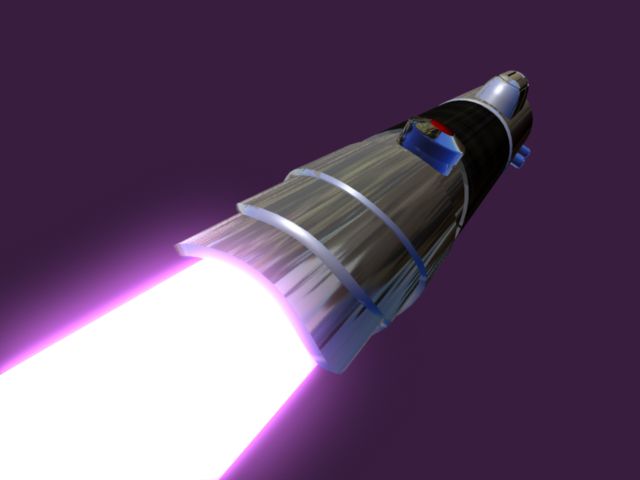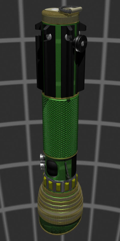 Another lightsaber I modeled from pictures on www.thelightsaber.com, this one appealed to me for the concept of Darian's lightsaber. Some of the metal forms drove me nuts for awhile, but the overall simple design still allowed me to finish it in one day.